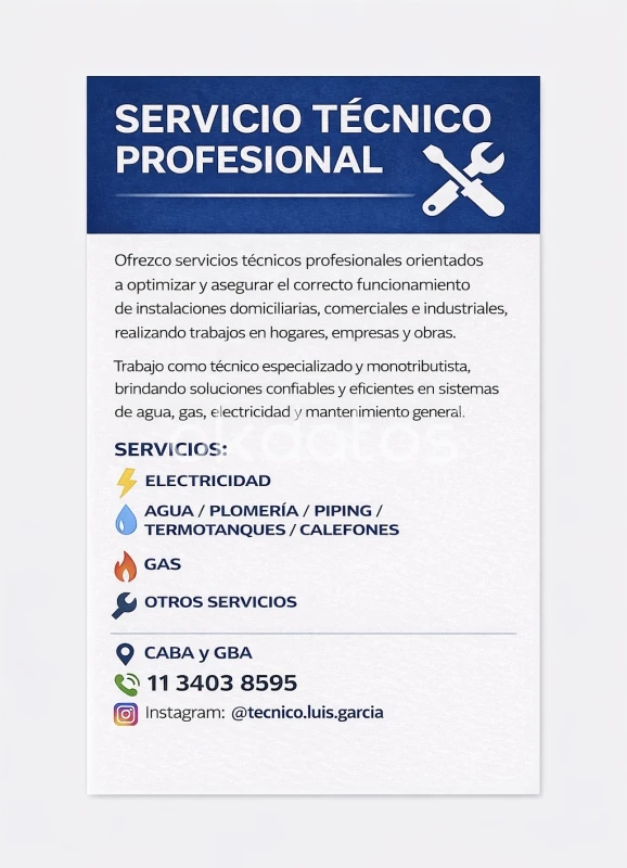 Servicio técnico profesional para hogares, comercios e industrias. Trabajos confiables y prolijos. 🔧 SERVICIOS: ⚡ Electricidad 💧 Plomería / Agua / Piping 🔥 Gas 🛠️ Mantenimiento general 📍 CABA y GBA 📞 11 3403 8595 📸 @tecnico.luis.garcia Consultas sin compromiso.