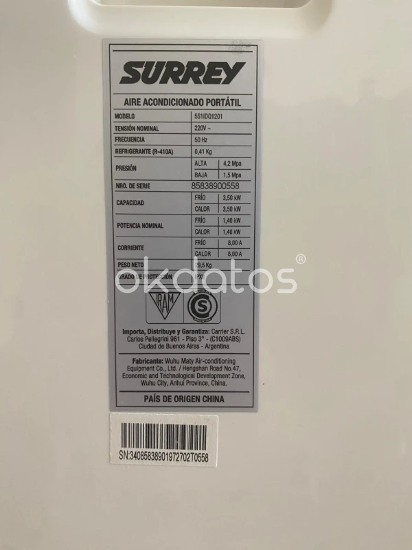Vendo aire acondicionado portátil Surrey modelo 551ID01201, en excelente estado y funcionando perfecto. Ideal para ambientes pequeños y medianos. Se puede usar todo el año porque tiene frío y calor. ✔ Características Frío / Calor: Sí Capacidad: 3,50 kW (frío y calor) Potencia: 1,40 kW Corriente: 8 A Refrigerante: R410A Peso: 29,5 kg Funciona silencioso, fácil de mover (tiene ruedas). ✔ Estado Muy bien cuidado (ver fotos). Sin golpes ni partes rotas. Uso normal, siempre en interior. Incluye cable original.