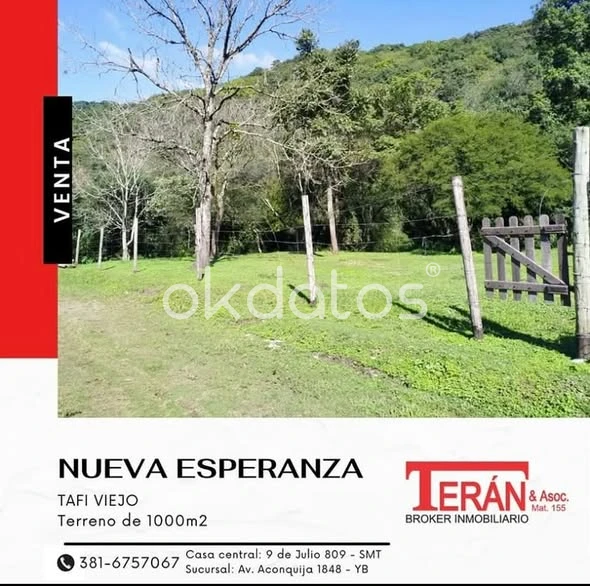 LOTE NUEVA ESPERANZA - TAFI VIEJO TERRENO DE : 1000m2 EL TERRENO SE ENCUENTRA EN MEDIO DE LA NATURALEZA TIENE AGUA Y GAS. PROXIMO A ESCRITURAR. A 20 MINUTOS DEL CENTRO DE TUCUMÁN DISPONE DE UNA ISLA CONTACTOS: +54 9 3813 47-2460 - ZAMIRA + 54 9 3815 86-5875 - JORGE TERÁN