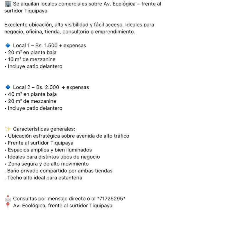 Excelente ubicación, alta visibilidad y fácil acceso. Ideales para negocio, oficina, tienda, consultorio o emprendimiento. 🔹 Local 1 – Bs. 1.500 + expensas • 20 m² en planta baja • 10 m² de mezzanine • Incluye patio delantero 🔹 Local 2 – Bs. 2.000 + expensas • 40 m² en planta baja • 20 m² de mezzanine • Incluye patio delantero ✨ Características generales: • Ubicación estratégica sobre avenida de alto tráfico • Frente al surtidor Tiquipaya • Espacios amplios y bien iluminados • Ideales para distintos tipos de negocio • Zona segura y de alto movimiento . Baño privado compartido por ambas tiendas . Techo alto ideal para estantería 📩 Consultas por mensaje directo o al *71725295*