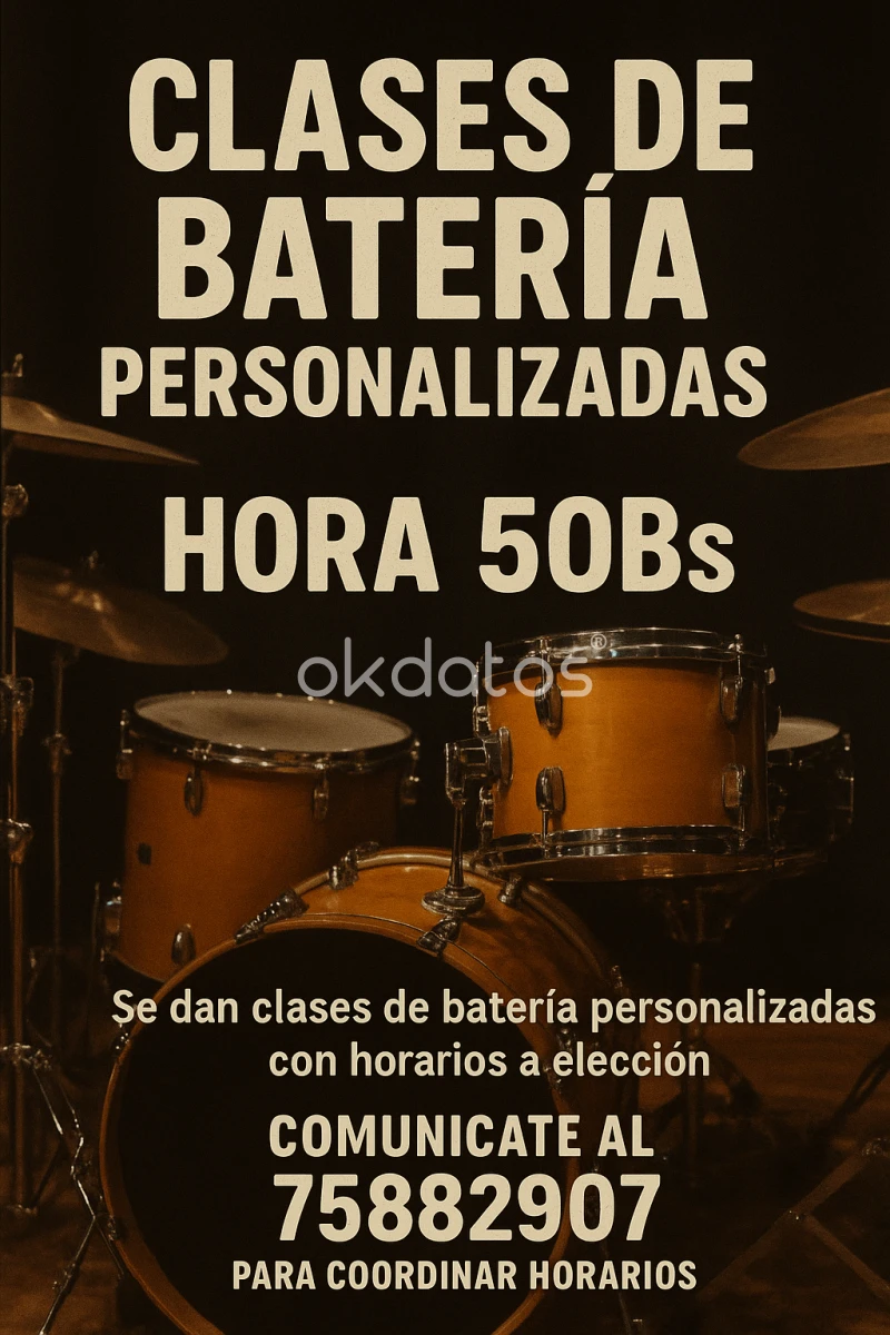 Se dan clases personalizadas de bateria para cualquier edad, con horarios a elecion a 50bs la hora. comunicate al 75882907 para coordinar tu horario! La Paz - Bolivia