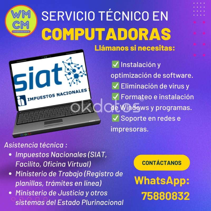Ofrecemos soluciones rápidas y confiables para que tu equipo y tus trámites nunca se detengan: 🖥️ Computadoras, Laptops e Impresoras Reparación y mantenimiento preventivo/correctivo Instalación y actualización de programas Optimización de velocidad y rendimiento Respaldo y recuperación de datos ⚙️ Asistencia Técnica en Sistemas del Estado Impuestos Nacionales (SIAT, Facilito, Oficina Virtual) Ministerio de Trabajo (planillas, registros, trámites en línea) Otros sistemas estatales del Estado Plurinacional ✅ Experiencia, seriedad y atención personalizada. ✅ Soporte presencial y remoto en La Paz y El Alto. 📞 Contáctanos al 75880832 – WhatsApp disponible