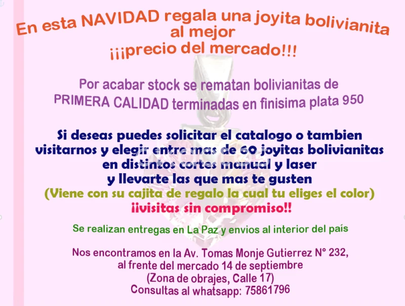 Por Navidad, Venta de joyas bolivianitas a precios económicos Se ofrece hermosas joyas bolivianitas (ametrino) en distintos cortes manual y laser acabadas en finísima plata 950 al precio más bajo del mercado. Puede solicitar el catálogo o también nos pueden visitar ¡¡¡sin compromiso!!! y elegir entre más de 60 joyas bolivianitas la que más le guste (Por joyita comprada se entrega una cajita de regalo, usted elige el color y modelo de la cajita) Se realizan entregas en La Paz y para todo el interior del país Nos encontramos en la Av. Tomas Monje Gutierrez N° 232 (Zona de Obrajes, Calle 17) Consultas al whatsapp: 75861796
