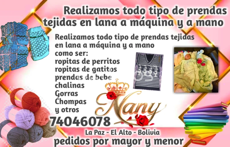 realizamos todo tipo de prendas tejidas a mano y máquina, por docena o unidad. cel. 74046078