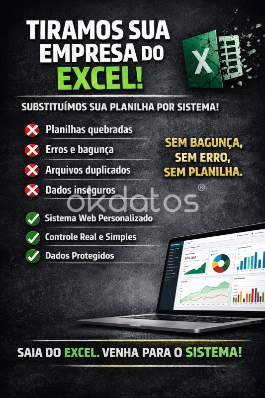 Oferecemos desenvolvimento de sistemas web personalizados para empresas que hoje utilizam planilhas Excel para controle. O sistema substitui planilhas por um painel online, com dados centralizados, controle por usuário e relatórios automáticos. Ideal para: Controle de estoque Produção Financeiro simples Vendas e serviços Funcionalidades: Painel web acessível de qualquer lugar Controle de usuários Dados organizados e seguros Relatórios automáticos Realizamos análise gratuita das planilhas atuais para definir a melhor solução.