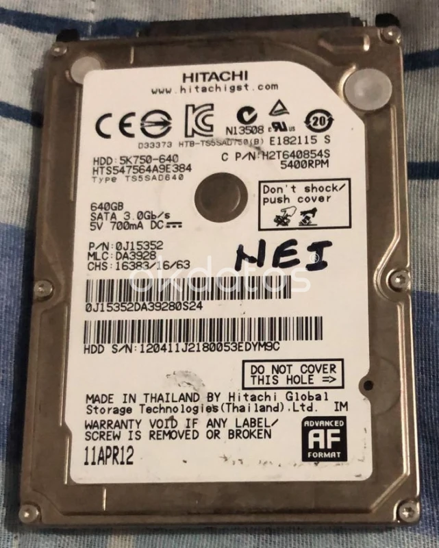 Armazene seus arquivos com segurança e velocidade! HD de notebook Hitachi 640GB SATA Slim, perfeito para quem busca desempenho e confiabilidade. Ideal para notebooks, garantindo espaço e acesso rápido aos seus dados. Venda por UNIDADE. 01 disponível. HD interno para notebook Capacidade: 640GB Formato: 2.5? (Slim) Interface: SATA -Testado -Funcionando perfeitamente -Boa opção para notebooks antigos Produto usado, conforme fotos reais. Entrega a combinar ou envio por conta do comprador.
