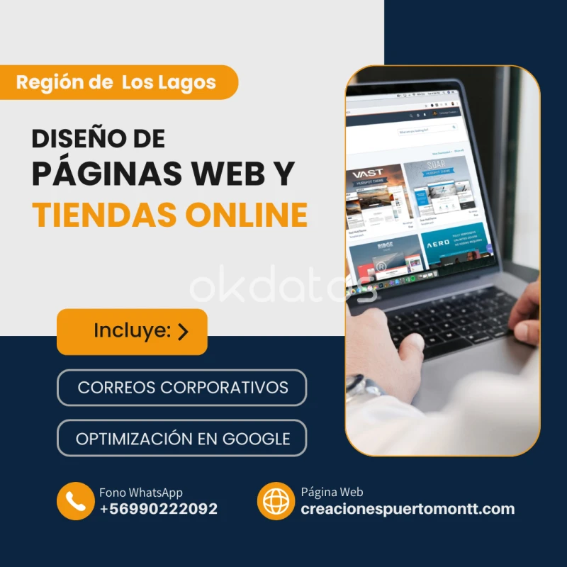 Creaciones Web Puerto Montt ofrece diseño y desarrollo de páginas web y tiendas ecommerce para empresas y emprendedores de Puerto Montt, Puerto Varas, Chiloé y toda la Región de Los Lagos. Con más de 10 años de experiencia, creamos sitios modernos, rápidos y optimizados que destacan por su calidad, funcionalidad y precios accesibles. Desarrollamos páginas profesionales, catálogos digitales y tiendas online de alto rendimiento, totalmente adaptadas a móviles y pensadas para atraer clientes y potenciar ventas. Confía en una agencia local con trayectoria, soporte real y resultados comprobados. Contáctenos y solicite más información: Fono WhatsApp: +56 9 9022 2092 Email: info@creacionespuertomontt.com Página Web: www.creacionespuertomontt.com