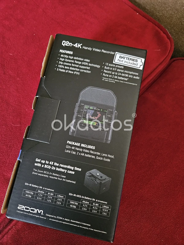 CARACTERÍSTICAS Lente gran angular de 150° de alta calidad (f2.8/15.2 mm) 12 opciones de ‘Scene’ para su uso en distintos entornos de iluminación, incluyendo el ajuste ‘Auto’ que se adapta de forma inteligente a su entorno Micrófonos estéreo X/Y incorporados capaces de manejar niveles de sonido de hasta 120 dB SPL Puede usarse como grabadora de audio autónoma, con los datos guardados en formato WAV, de hasta 24-bit/96 kHz 5 ajustes campo de visión (FOV) Graba directamente a tarjetas micro microSD, microSDHC y microSDXC de hasta 256 GB para tiempos de grabación prolongados Sencilla forma de grabación con un sólo botón Pantalla LCD a color Soporte para tres resoluciones de vídeo HD: 720p, 1080p y 4K Tasas de bit de vídeo de hasta 76 Mbps para una calidad de imagen mejorada Frame rates: 4K/30fps, 4K/25fps, 4K/24fps, 1080p/60fps, 1080p/50fps, 1080p/30fps, 1080p/25fps, 1080p/24fps, 720p/30fps, 720p/25fps Salida de vídeo HDMI para conexión a HDTVs, seleccionable entre NTSC y PAL Graba vídeo (con audio) en formato MOV Control de nivel estilo analógico con medición digital en pantalla La función Auto Gain le aporta control automático sobre el nivel de entrada de audio Entrada estéreo para uso con dispositivos externos además de soporte para alimentación plug-in Salida para auriculares/nivel de línea para una rápida monitorización del audio Filtro paso-bajo para la eliminación de ruido de viento y ruidos sordos de bajas frecuencias Interfaz USB para la transmisión en directo y transferencia de datos Compatible con OBS Open Broadcaster Software, Skype y otras aplicaciones de streaming populares Función micro USB (con monitorización directa de baja latencia) cuando se usa con ordenadores y dispositivos iOS (requiere un kit Apple Camera Connection o Lighting a USB Camera Adapter para su uso con dispositivos iOS) Funciona con dos pilas AA Soporte para trípode estándar incorporado Incluido en el paquete Aquí está lo que viene incluido con la Q2n-4K: Q2n-4K Handy Video Recorder Parasol para la lente Tapa para la lente Guía de arranque