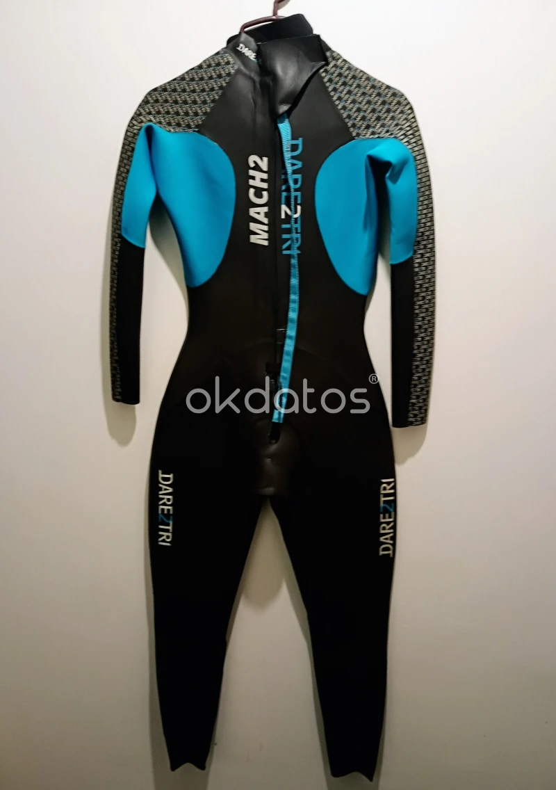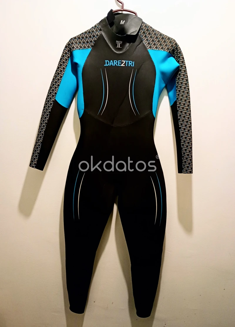 Dare2Tri Mach2 – Neopreno Triatlón / Talla M Traje de neopreno profesional diseñado para alto rendimiento en triatlón y natación en aguas abiertas. Neopreno 39-cell flexible y resistente. Hombros y brazos: 2,5 mm | Bajo brazos: 2 mm | Pecho: 5 mm | Cuello: 2 mm. Mangas largas, gran movilidad y flotabilidad. Cremallera metálica de alta durabilidad. Estado: sin uso