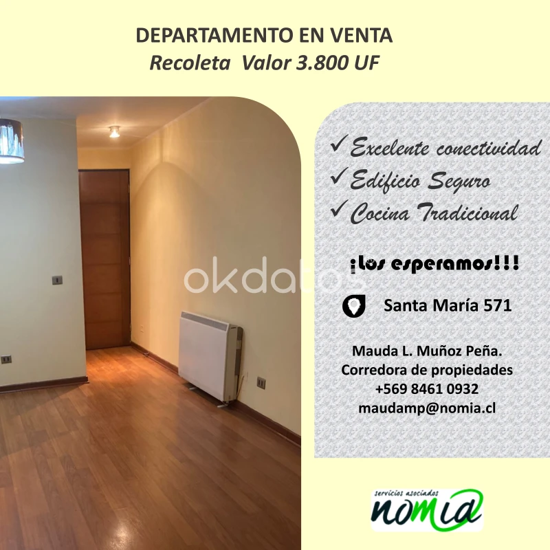 Departamento 2 Dormitorios y 2 baños. Excelente estado de conservación. Estacionamiento y bodega. Maravillosa vista 360º de Santiago. Ubicado en Avda. Santa María #571, Edificio Santa María Forestal. Recoleta. Accesibilidad, locomoción colectiva inmediata, comercios, supermercados y servicios en general. Esquina Avda. Recoleta, a cuadras de estaciones de Metro Puente Cal y Canto, Bellas Artes y Patronato. Terreno 63 mt2. Terraza 2 mt2. Orientación nor poniente. Departamento con buena luz natural. Dormitorio principal con baño en suite, closet, piso alfombrado. Cortinas Roller. Cocina tradicional amoblada y equipada. El precio de venta es de 3.800 UF. También tenemos la alternativa de arriendo con opción de compra. Para más información, encantada de atenderlos. Mauda Muñoz P. Corredora de propiedades +569 8461 0932 maudamp@nomia.cl