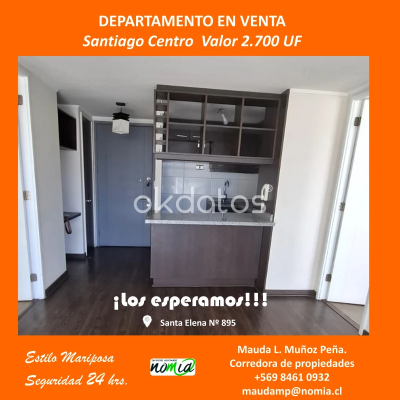 Vendemos cómodo departamento con excelente ubicación a 2 cuadras de Estación de Metro Irarrázaval, Ubicado en calle Santa Elena Nº895, Santiago Centro. Características: • 2 dormitorios y 2 baños • 1 estacionamiento y 1 bodega • Estilo mariposa • Locomoción cercana, (conexiones líneas 3-5), a una cuadra de Avda. Vicuña Mackenna • Cercano a restaurantes, divertimento, farmacias, supermercado Lider, comercio, colegios, guarderías, etc. • Terraza • Se aceptan mascotas • Ingreso controlado y más. El precio de venta es de 2.700 UF, venta o arriendo con opción de compra. Para más información, encantada de atenderlos. Mauda L. Muñoz P. Corredora de propiedades +569 8461 0932 maudamp@nomia.cl
