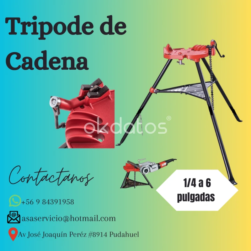 ASA II Ventas ofrece el Trípode de Cadena, un accesorio robusto y estable para trabajos con tuberías de 1/8" a 6 pulgadas. Ideal para corte, biselado, soldadura y roscado, cuenta con patas plegables para fácil transporte y viene con servicio técnico, repuestos, accesorios y diversas opciones de pago, asegurando seguridad y eficiencia en faenas y talleres.