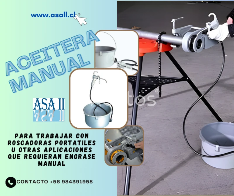 🚀 Aceitera Manual de Balde – ASA II VENTAS ¡Lubrica rápido, protege tus herramientas y consigue roscas perfectas! 💪 Flujo constante, gatillo ergonómico y manguera de 1.4 m. Ideal para uso industrial. ⚙️ ✅ Servicio y repuestos siempre disponibles. 📞 226497078 | 📱 +56 9 84391958 | 📍 Pudahuel, Santiago