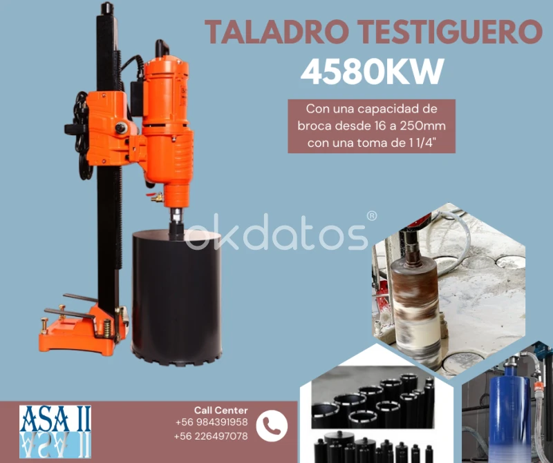 ASA II ofrece una testiguera de hormigón de 4580W, diseñada para perforar concreto con alta precisión y velocidad. Incluye un rango de perforación de 15 a 250 mm, estructura robusta y disponibilidad de brocas para distintos proyectos. Además, ofrecen múltiples medios de pago y asesoría para elegir el equipo adecuado, con atención en Pudahuel, Santiago