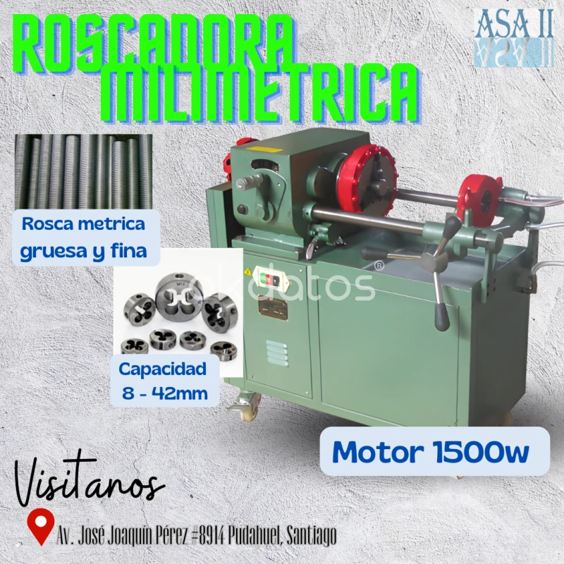 ASA II VENTAS ofrece roscadoras de mesón para trabajos de roscado de alta precisión, especialmente en hilo métrico grueso. Destacan por su estabilidad, operación eléctrica eficiente y versatilidad para piezas como pernos y barras. Incluyen servicio técnico, repuestos, asesoría y múltiples opciones de pago.