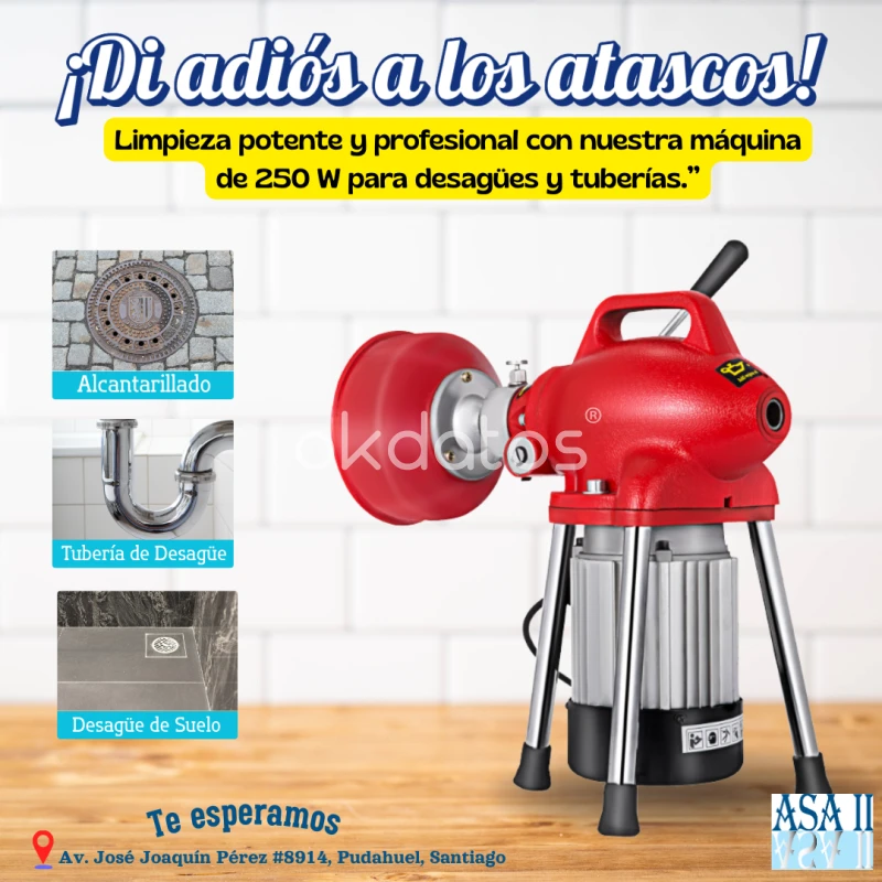 ¿Problemas con tuberías o desagües? En ASA II Ventas tenemos la solución: Máquinas Destapadoras de Alcantarillado, diseñadas para trabajos exigentes y resultados profesionales. Modelos manuales y eléctricos Alta flexibilidad para zonas difíciles Uso en hogares, comercios e industrias Servicio técnico, repuestos y accesorios disponibles Equipos confiables para que tu trabajo no se detenga. Facilidades de pago: efectivo, transferencia, tarjetas y Webpay. Cotiza con nosotros: WhatsApp: +56 9 84391958 Ubicación: Pudahuel, Santiago