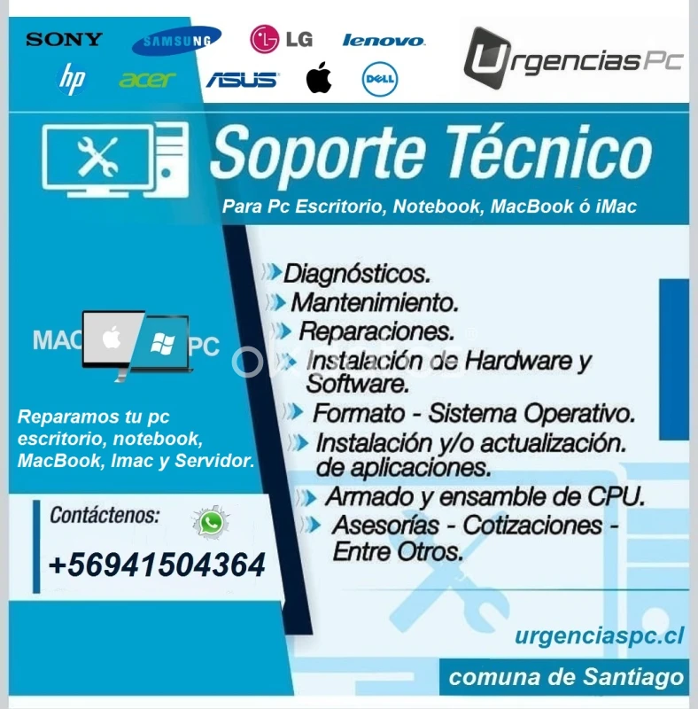 Mantenimiento Preventivo de Computadores Santiago RM PC | Notebook | Servidores | Windows y Mac No espere a que su computador deje de funcionar. La mayoría de las fallas se desarrollan con el tiempo, tanto a nivel de hardware como de software y sistema operativo. Una mantención oportuna permite prevenir fallas, mejorar el rendimiento y reducir el riesgo de pérdida de información. ¿Qué se revisa en la mantención? • Limpieza interna y externa • Revisión de temperaturas y ventilación • Diagnóstico general de hardware • Revisión del sistema operativo • Detección de virus, malware, procesos innecesarios y archivos temporales. Equipos atendidos: -PC de escritorio, Notebooks y Servidores -Windows y macOS Atención a: Hogares, pequeñas y medianas empresas, oficinas. Cobertura: Servicio a domicilio o en local comercial (comuna de Santiago). Toda la Región Metropolitana. Valores de servicio: Definidos previa evaluación según equipo, cantidad, ubicación y agenda. Contacto: Respuesta más rápida por celular ó vía WhatsApp (número publicado). Horarios: Lunes a sábado, 9:00 a 18:30 hrs. Cupos limitados por agenda. RECOMENDACIÓN: Si su computador funciona, este es el mejor momento para hacer mantenimiento. Esperar a que falle puede generar pérdida de información y mayores costos. REGION METROPOLITANA Santiago de Chile Urgenciaspcpuntocl 2026