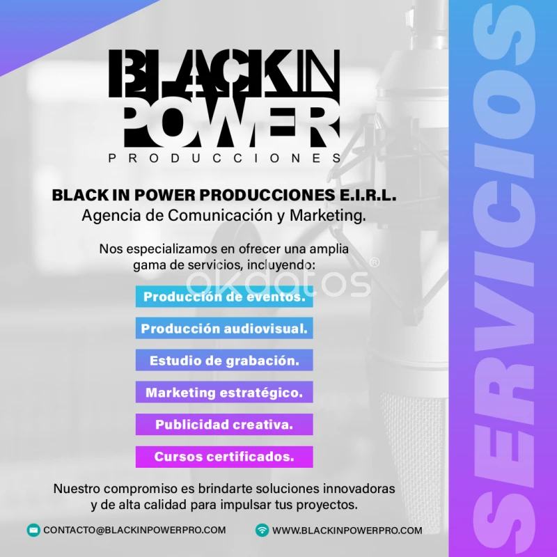 En Black In Power Producciones nos especializamos en crear estrategias de comunicación efectivas, eventos de alto impacto, y producciones audiovisuales de primer nivel. Nuestro equipo experto combina creatividad y tecnología para potenciar tu marca con publicidad estratégica y cursos certificados. Dale voz a tu empresa y alcanza tus objetivos con servicios profesionales y atención personalizada. Agenda una reunión y déjanos sorprenderte.