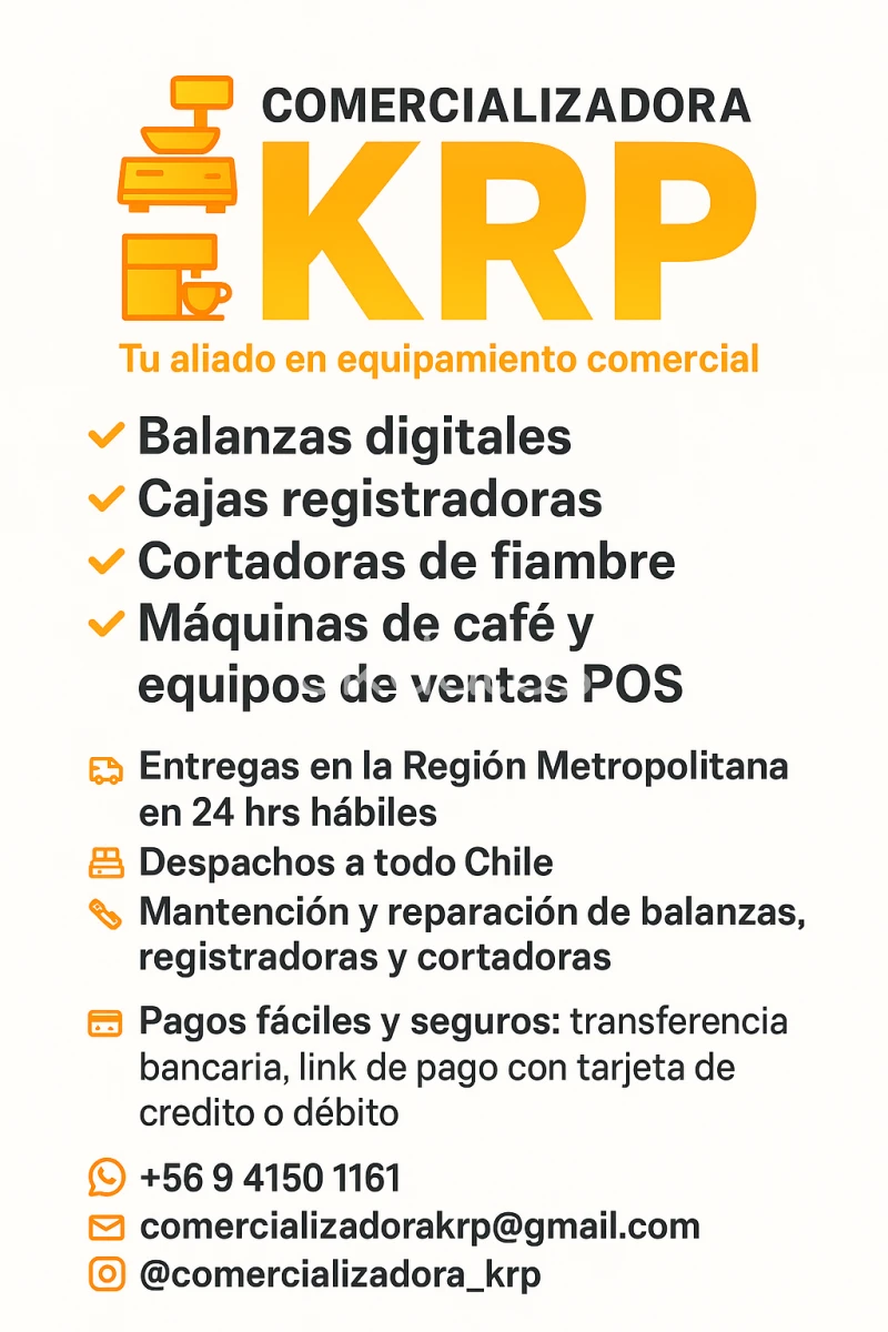 ¿Tienes un negocio y necesitas equiparlo de forma profesional? En Comercializadora KRP SPA tenemos todo lo que buscas: ✅ Balanzas digitales de alta precisión ✅ Balanzas de alto rango ✅ Cajas registradoras ✅ Implementación punto de venta (software) ✅ Cortadoras de fiambre de alto rendimiento ✅ Máquinas de café ✅ Maquinas de helado ✅ Equipamiento de mantención de alimentos ✅ Entre otros productos Además: 🚚 Entregas en la Región Metropolitana en 24 hrs hábiles 📦 Despachos a todo Chile a través de empresas de transporte 🔧 Servicio de mantención y reparación de balanzas, registradoras y cortadoras 💳 Pagos fáciles y seguros: transferencia bancaria, link de pago con tarjeta de crédito o débito 📲 Contáctanos: 📞 +56 9 4150 1161 (celular / WhatsApp) 📧 comercializadorakrp@gmail.com 📱 Instagram: @comercializadora_krp 👉 ¡Cotiza con nosotros hoy mismo! Comercializadora KRP SPA – Tu aliado en equipamiento comercial