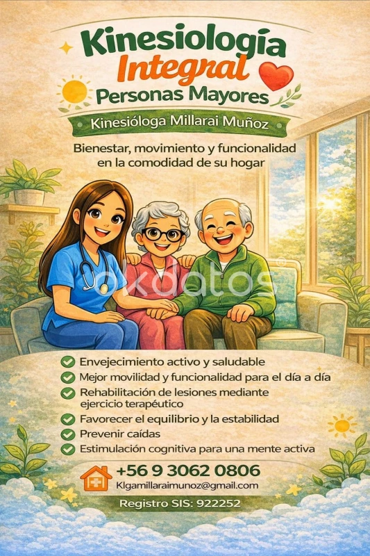 Atención especializada para adultos mayores, enfocada en mejorar la funcionalidad, movilidad y calidad de vida, en la comodidad de su hogar 🏡 ✔️ Rehabilitación física y mantenimiento funcional ✔️ Prevención de caídas ✔️ Ejercicio terapéutico personalizado ✔️ Estimulación cognitiva y motora ✔️ Apoyo en recuperación post enfermedad o cirugía 👩⚕️ Kinesióloga con experiencia en área geriátrica y enfoque integral en el adulto mayor 📍 Atención en Región Metropolitana