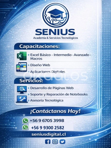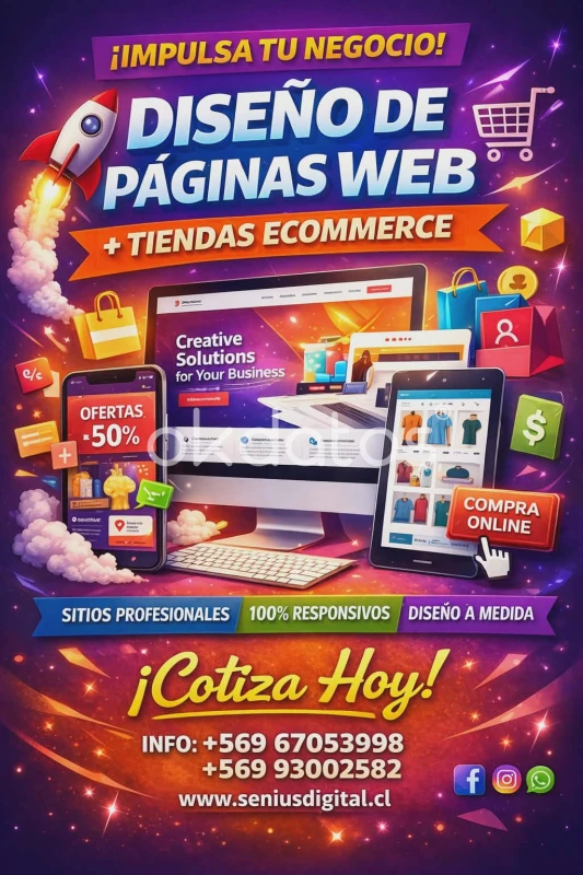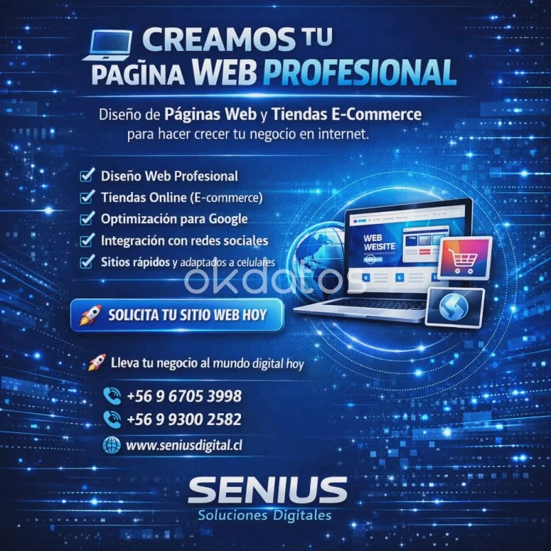 Desarrollo de páginas web profesionales Tiendas online (ecommerce) con carrito de compras Sistemas y software a medida para empresas Diseño web moderno y adaptable a celulares Integración de pagos online Soluciones para: • Negocios que quieren vender por internet • Empresas que necesitan sistemas personalizados • Emprendedores que quieren presencia profesional online Soporte y asesoría Precios accesibles según el proyecto Atención online para todo Chile Consultas por WhatsApp o mensaje WhatsApp +56 967053998 WhatsApp +56 993002582 seniusdigital@gmail.com www.seniusdigital.cl