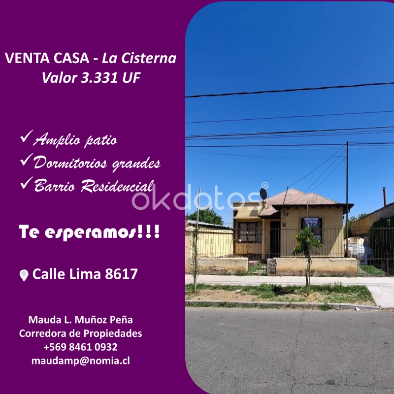 Vendemos casa con 4 dormitorios, 1 baño, estacionamiento. Construcción sólida. Gran terreno ubicado en Calle Lima Nº 8617. Villa Augusto Biaut. La Cisterna. Características: • Terreno 294 mt2 • Patio lateral, capacidad 3 vehículos • Patio antejardín 30 mts2 • Amplio patio trasero • 4 dormitorio, 1 Baño, Living comedor amplios. • Excelente accesibilidad y conectividad por estar emplazada en punto medio de ruta 5 (Autopista central) • Locomoción colectiva a 1 cuadra (a 10 minutos de Intermodal La Cisterna) El precio de venta es de 3.331 UF. Para más información, encantada de atenderlos. Mauda Muñoz P. Corredora de Propiedades +569 8461 0932 maudamp@nomia.cl