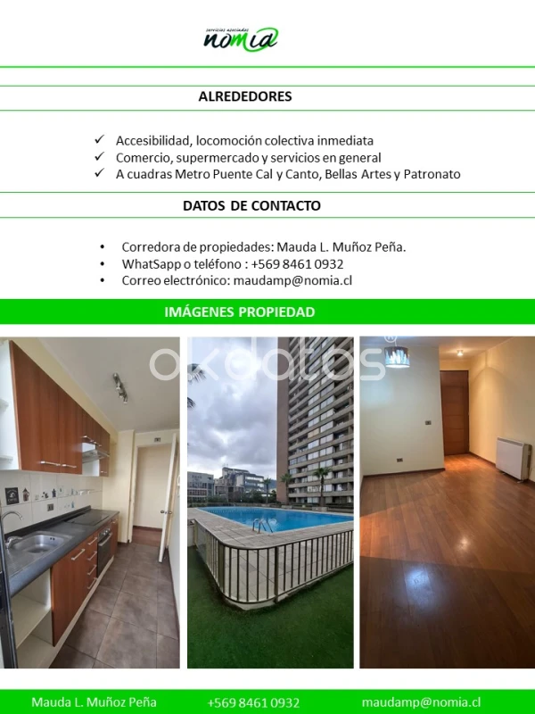 Características • Departamento 2 Dormitorios y 2 baños. • Excelente estado de conservación. • Estacionamiento y bodega • Maravillosa vista 360º de Santiago • Ubicado en Avda. Santa María #571, Edificio Santa María Forestal. Recoleta. • Accesibilidad, locomoción colectiva inmediata, comercios, supermercados y servicios en general • Esquina Avda. Recoleta, a cuadras de estaciones de Metro Puente Cal y Canto, Bellas Artes y Patronato. • Terreno 63 mt2. Terraza 2 mt2. Orientación nor poniente. Departamento con buena luz natural. Dormitorio principal con baño en suite, closet, piso alfombrado. Cortinas Roller. Cocina tradicional amoblada y equipada. El precio de venta es de 3.800 UF. También tenemos la alternativa de arriendo con opción de compra. Para más información, encantada de atenderlos. Mauda Muñoz P. Corredora de propiedades +569 8461 0932 maudamp@nomia.cl