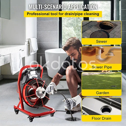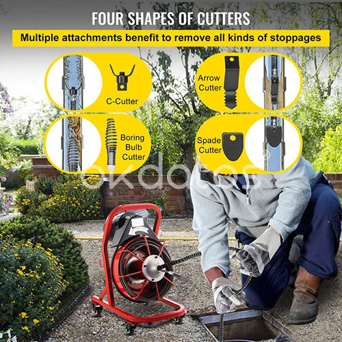Nuestra máquina desatascadora utiliza un cable de acero serpenteante accionado por motor para eliminar fácilmente las obstrucciones más difíciles. Sus ventajas incluyen ahorro de mano de obra y energía, respeto al medio ambiente (sin contaminación química) y un funcionamiento sencillo, lo que le permite desatascar sus desagües en casa y simplifica su trabajo.