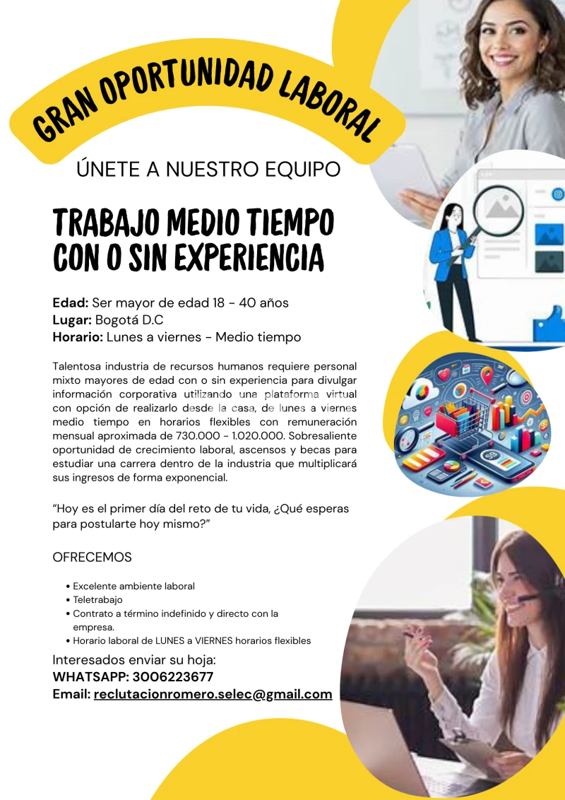 Empresa en expansión solicita hombres y mujeres con o sin experiencia para laborar en actividades auxiliares de oficina como correspondencia, digitación, recepción de llamadas, controles y registro, selección de personal y supervisión de personal, entre otras; De lunes a viernes medio tiempo en horarios flexibles. Oportunidad de crecimiento laboral, ascensos y becas de estudio para una carrera dentro de la compañía. REQUISITOS: Tener entre 18-40 años Manejo de herramientas ofimáticas básicas Residir en la ciudad de Bogotá Bachiller completo Si está interesado para mayor información envíe su hoja de vida al correo reclutacionromero.selec@gmail.com o interesados comunicarse al whatsapp celular 3006223677. ¡NO DUDES EN POSTULARTE!