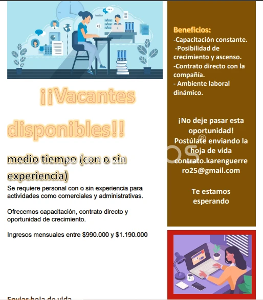 Trabajo medio tiempo – Bogotá Se solicita personal con o sin experiencia. Horarios flexibles y modalidad remota parcial. Ingresos entre $990.000 y $1.190.000. Enviar hoja de Vida a:contrato.karenguerrero25@gmail.com