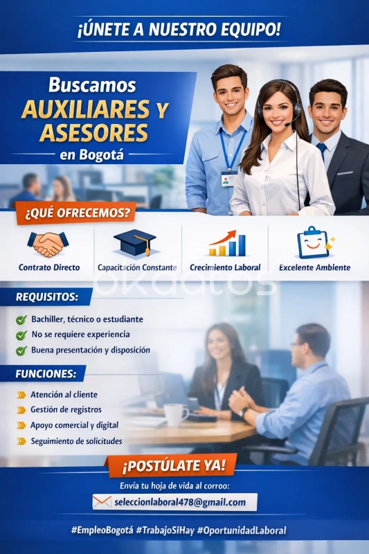 OFERTA LABORAL – OPORTUNIDAD DE EMPLEO Importante empresa en proceso de expansión requiere personal para el área administrativa y apoyo en oficina. 🔹 Funciones principales: • Apoyo en gestión de archivos y documentos • Atención básica a clientes y orientación • Manejo de información y registros • Apoyo en procesos internos de selección y citaciones 🔹 Requisitos: • Mayor de edad • Buena actitud y responsabilidad • Con o sin experiencia • Disponibilidad inmediata 🔹 Ofrecemos: • Capacitación constante • Ingresos semanales • Horarios flexibles • Excelente ambiente laboral • Oportunidad de crecimiento 📩 Interesados enviar hoja de vida al correo: seleccionlaboral478@gmail.com