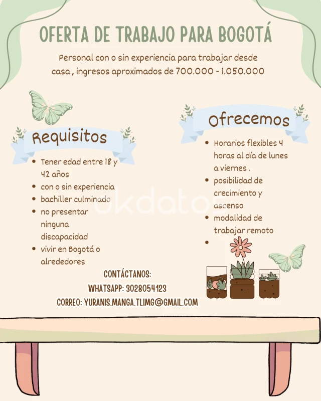 🌟¡Estamos contratando!🌟 Medio tiempo -- con o sin experiencia. Somos una compañía en crecimiento y buscamos personas dinámicas, proactivas y con ganas de aprender para desempeñar funciones como: ⚪ Publicidad y promoción de la empresa ⚪ Selección de hojas de vida y manejo de personal ⚪ Agendamiento de citas y apoyo administrativo ⚪ Actividades comerciales básicas . 💼 Modalidad medio tiempo (horarios flexibles) 📍 Ubicación: Bogotá / modalidad remota parcial ) 💰 Ingresos aproximados $700.000 -- 1.050.000 mensuales 🗃️ Experiencia: con o sin experiencia BENEFICIOS ∆ Capacitación constante ∆ Posibilidad de crecimiento y ascenso ∆ Ambiente laboral dinámico ♦️¡ No dejes pasar esta oportunidad! ♦️ 📩Postúlate enviando tú hoja de vida al correo yuranis.manga.tlimg@gmail.com o al WhatsApp 3️⃣0️⃣2️⃣-8️⃣0️⃣5️⃣-4️⃣1️⃣2️⃣3️⃣