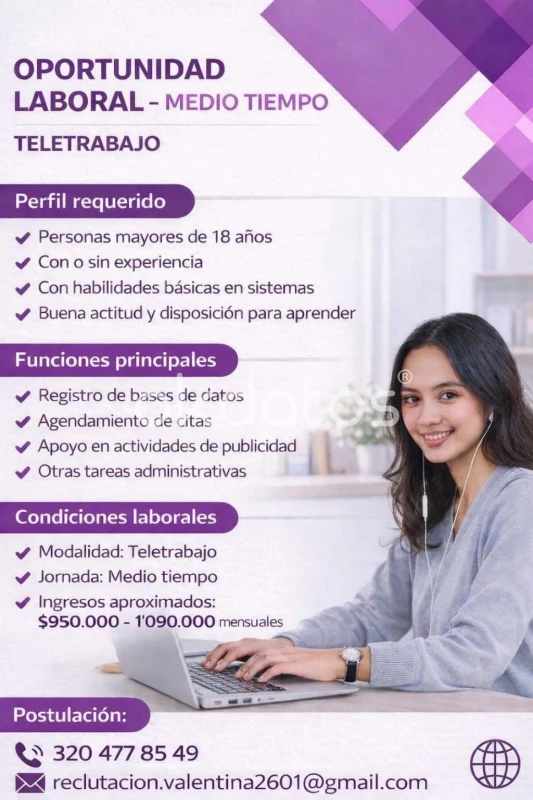 Nuestra empresa está buscando gente con espíritu emprendedor y proactivos🔔, para trabajar en jornadas de medio turno (4 horas) con horarios flexibles de lunes a viernes, No fines de semana ni Festivos ⏰ en modalidad Teletrabajo💻🏠, en funcionalidades como: bases de datos, registros, controles. No es necesario tener experiencia porque capacitaremos a los elegidos. Salario entre 950.000 - 1'090.000💰más bonificaciones Requisitos: Mayor de edad. Residencia en Bogotá. Proactividad y emprendimiento. Para mayor información comunicarse por este mismo medio o 📌Correo: reclutacion.valentina2601@gmail.com Preguntando por: Valentina Galindo🔔