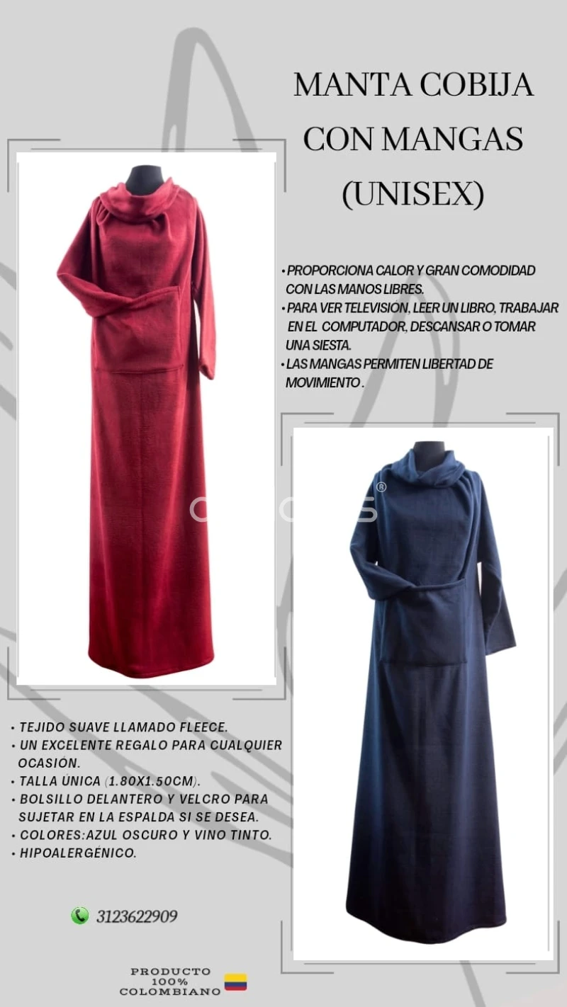 La Cobija Con Mangas 100% Colombiana es la solución perfecta para quienes buscan comodidad y calidez en su día a día. Diseñada para adaptarse a tus movimientos, esta cobija te permite disfrutar de tus actividades favoritas sin renunciar a la calidez que necesitas. Ideal para leer, ver televisión o trabajar desde casa, su diseño práctico y funcional te mantendrá abrigado mientras mantienes tus manos libres. Fabricada con materiales de alta calidad, esta cobija es suave al tacto y ofrece una excelente durabilidad. Su confección en Colombia garantiza un producto que respeta los estándares locales de calidad y sostenibilidad. Además, su diseño atractivo se adapta a cualquier estilo de decoración, convirtiéndola en un elemento versátil para tu hogar. La Cobija Con Mangas es perfecta para todas las edades, convirtiéndose en un regalo ideal para familiares y amigos. Su ligereza y facilidad de uso la hacen indispensable en cualquier temporada, ya sea para las noches frías de invierno o para esos días frescos de primavera. No te quedes sin la tuya y transforma tu experiencia de descanso y relajación. Largo 1.80cm ancho 1.50 cm, trae un bolsillo delantero