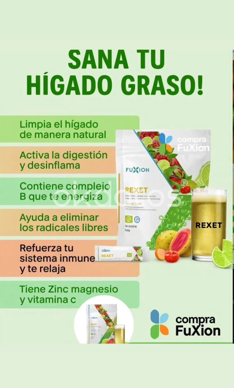 Dale un respiro a tu cuerpo con Rexet 🍹, la bebida efervescente que protege y desintoxica tu hígado 🫀💚. Con ingredientes naturales como alcachofa, perejil, hierba luisa, acerola y clorofila 🌱, más vitaminas y minerales esenciales 💊, Rexet te ayuda a mantener tu metabolismo hepático saludable y tu cuerpo limpio por dentro. Disuelve un sobre en agua fría ❄️💧 y disfruta de un “reset” natural para tu bienestar 🌟✨. Perfecto para tu rutina diaria o después de comidas pesadas 🍽️.