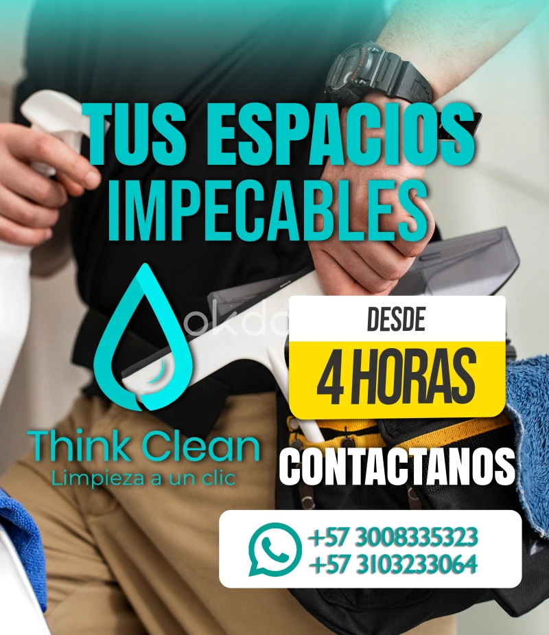 Think Clean – Servicio de Aseo a Domicilio y Empresarial en Bogotá ¿Buscas un servicio de aseo confiable en Bogotá? En Think Clean somos especialistas en limpieza a domicilio, aseo por horas, limpieza para oficinas y servicio de aseo personalizado. Contamos con personal de limpieza altamente capacitado, puntual y de confianza, listo para atender tus necesidades de limpieza en el hogar o la empresa. Ofrecemos servicios de: Aseo a domicilio en Bogotá Limpieza por horas o por días Servicio de limpieza para oficinas y empresas Personal de aseo confiable y profesional Aseo con productos e implementos incluidos (si se requiere) Adaptamos el servicio según tu necesidad: limpieza profunda, mantenimiento general, aseo post obra, limpieza por mudanza o desinfección. Atendemos en toda Bogotá. Si estás buscando: Servicio de aseo a domicilio Aseo por horas Bogotá Personal de limpieza confiable Empresa de limpieza profesional Servicio de aseo urgente o programado Think Clean es tu mejor opción. Agenda tu servicio hoy mismo. Contáctanos por WhatsApp: +57 310 323 3064 Atención inmediata