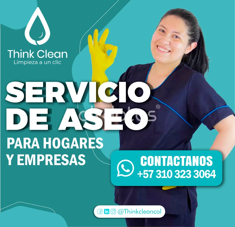 Think Clean – Servicio de Aseo a Domicilio y Empresarial en Bogotá ¿Buscas un servicio de aseo confiable en Bogotá? En Think Clean somos especialistas en limpieza a domicilio, aseo por horas, limpieza para oficinas y servicio de aseo personalizado. Contamos con personal de limpieza altamente capacitado, puntual y de confianza, listo para atender tus necesidades de limpieza en el hogar o la empresa. Ofrecemos servicios de: Aseo a domicilio en Bogotá Limpieza por horas o por días Servicio de limpieza para oficinas y empresas Personal de aseo confiable y profesional Aseo con productos e implementos incluidos (si se requiere) Adaptamos el servicio según tu necesidad: limpieza profunda, mantenimiento general, aseo post obra, limpieza por mudanza o desinfección. Atendemos en toda Bogotá. Si estás buscando: Servicio de aseo a domicilio Aseo por horas Bogotá Personal de limpieza confiable Empresa de limpieza profesional Servicio de aseo urgente o programado Think Clean es tu mejor opción. Agenda tu servicio hoy mismo. Contáctanos por WhatsApp: +57 310 323 3064 Atención inmediata