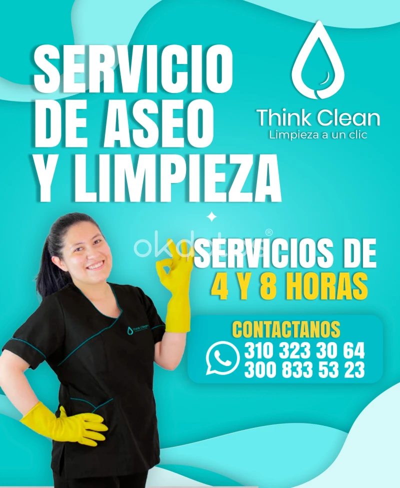 Think Clean ofrece servicio de aseo a domicilio y limpieza profesional en Bogotá. Contamos con personal de limpieza capacitado, confiable y puntual, ideal para hogares, oficinas y espacios empresariales. Atendemos en todos los sectores de Bogotá, especialmente zonas de estrato 4, 5 y 6. Ofrecemos aseo por horas, por días o programado según tus necesidades. Realizamos limpieza profunda, mantenimiento, aseo post obra, aseo por mudanza y desinfección. Nuestro personal está entrenado y cuenta con experiencia en limpieza residencial y empresarial. Puedes solicitar el servicio con o sin implementos incluidos. Si estás buscando servicio de aseo confiable, limpieza a domicilio en Bogotá, aseo por horas en el norte o sur de la ciudad, personal de limpieza por días, o una empresa de aseo profesional, Think Clean es tu mejor opción. Nuestra prioridad es ofrecer limpieza de alta calidad con atención inmediata y horarios flexibles. Contrata con nosotros si necesitas: servicio de aseo urgente, aseo a domicilio estrato 5, limpieza por horas en Bogotá, empresa de aseo confiable o personal de aseo con experiencia. Resolvemos tus necesidades de limpieza de forma rápida, eficiente y segura. Contáctanos por WhatsApp al +57 310 323 3064 y agenda tu servicio hoy mismo. Think Clean, limpieza profesional que se adapta a ti.