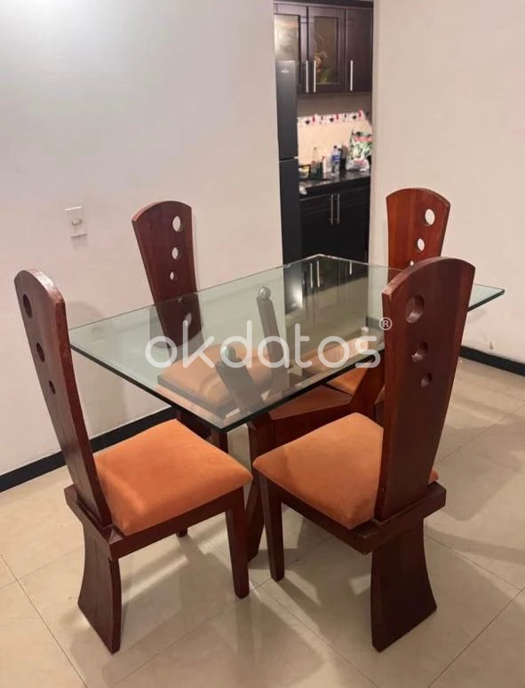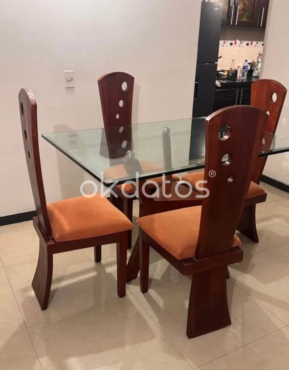 Vendo hermoso comedor de 4 puestos, ideal para apartamentos o espacios pequeños. Su diseño moderno combina perfectamente con cualquier ambiente y aporta elegancia al hogar. ✔ Mesa en vidrio grueso (templado) en muy buen estado ✔ Estructura en madera resistente (tono caoba) ✔ Sillas acolchadas, cómodas y firmes ✔ Diseño moderno con detalles decorativos ✔ Listo para usar Se encuentra en muy buen estado general, con detalles normales de uso que no afectan su funcionalidad. 📍 Ubicación: Calle 6b#80g-95 conjunto nuevo sol (Bogotá) 💰 Precio: $700.000 (negociables) 📲 Interesados escribir o llamar al 3123718986.