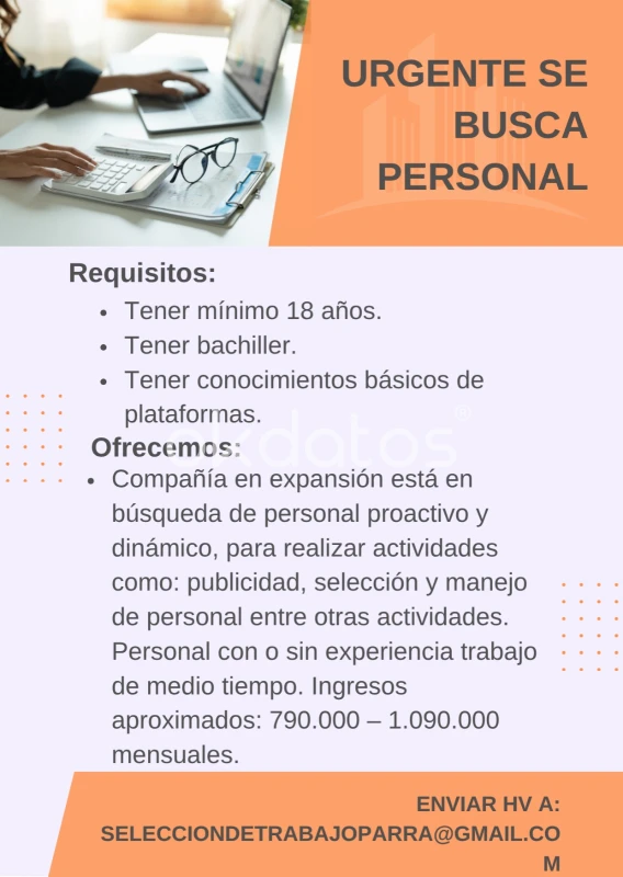 URGENTE BUSCAMOS HOMBRES Y MUJERES, BACHILLERES 11° CULMINADO. CON INTERES DE TENER SU PRIMERA EXPERIENCIA LABORAL Y DISPONIBILIDAD DE MEDIO TIEMPO, ACTIVIDAD A REALIZAR DENTRO DE LA COMPAÑÍA: SELECCIÓN DE PERSONAL, AGENDAMIENTO DE CITAS, RECEPCION DE LLAMADA, VERIFICACION DE DATOS Y REGISTRO DE DATOS. ENVIENOS SU HOJA DE VIDA. Importante compañía en crecimiento esta en búsqueda para su equipo de trabajo; Bachilleres con o sin experiencia, para llevar a cabo: recepción de llamadas telefónicas, verificación de datos, controles, registros, supervisión y apoyo en actividades de Marketing y Publicidad entre otras actividades. Requisitos Tener mínimo 18 años. Contar con internet. Contar con conocimientos básicos en plataforma. Vivir en Bogotá o sus alrededores. Tener bachiller. Trabajo de manera remota. Entrevista presencial.
