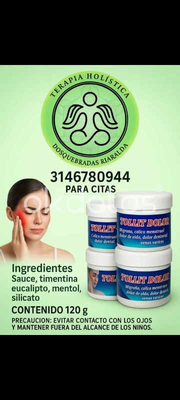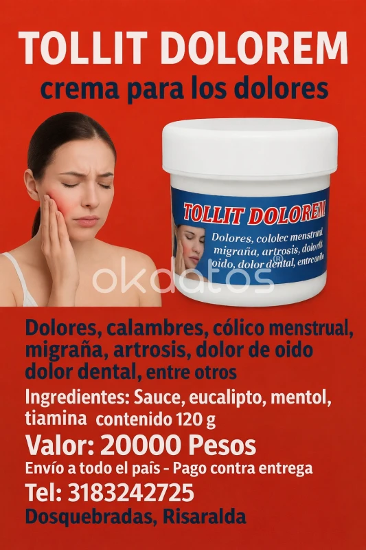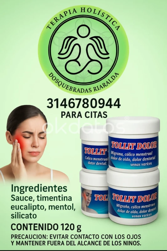 tollit, Dolor en, dolores de rodilla, artrosis, calambres dolores musculares, migraña, cólico menstrual, dolor de oido, vena varices, entre otros