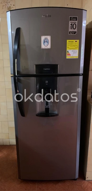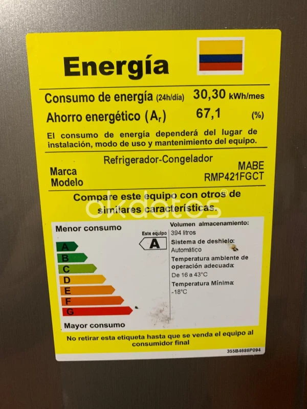 Nevera marca MABE con capacidad de 421 litros, ahorro de energía del 67.1% con clasificación A de máxima categoría de menor consumo, 394 litros volumen de almacenamiento. Comprada en marzo de 2024. Precio original $2.898.000.