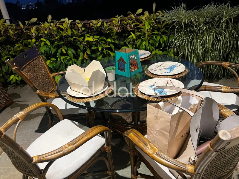 Comedor de 4 puestos ( 4 sillas con asiento acolchado y mesa redonda de centro con vidrio doble de seguridad) Material: Palma tailandesa Estilo: fino, tropical / boho / exterior premium Uso: exterior cubierto (balcón, terraza, jardín techado)