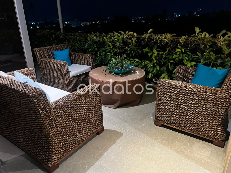 • Material: Palma Tailandesa sobre un marco, lo que le otorga durabilidad. • Estilo: El diseño tejido le da un aspecto clásico y natural, ideal para crear un ambiente acogedor en espacios al aire libre. • Comodidad: Incluye cojines gruesos, generalmente con fundas resistentes al agua y a los rayos UV, para mayor confort. • Uso: Es perfecto para áreas de conversación en exteriores, como se ve en la imagen, complementado con una iluminación ambiental suave.