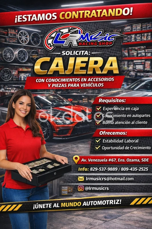 LR Music Racing Shop 🚗💨 📢 ¡ESTAMOS CONTRATANDO! 📢 LR Music Racing Shop solicita CAJERA para integrarse a nuestro equipo de trabajo. 🔹 Requisitos indispensables: ✔ Experiencia como cajera ✔ Conocimientos en accesorios y/o piezas para vehículos ✔ Buen manejo de clientes ✔ Responsable, organizada y con buena actitud ✔ Disponibilidad inmediata 🔹 Ofrecemos: ✅ Ambiente de trabajo dinámico ✅ Estabilidad laboral ✅ Oportunidad de crecimiento 📍 Ubicación: Avenida Venezuela #67, Ensanche Ozama, Santo Domingo Este (Entre Puerto Rico y Bonaire) 📲 Interesadas enviar información o comunicarse a: 📞 WhatsApp: 829-537-9889 📞 Teléfono: 809-435-2525 📧 Correo: lrmusicrs@hotmail.com 📸 Instagram: @lrmusicrs 🚘 Forma parte del mundo automotriz con LR Music Racing Shop Si quieres, también puedo adaptarlo al formato exacto de Instagram, hacerlo más corto, más formal o con emojis más llamativos 🔥