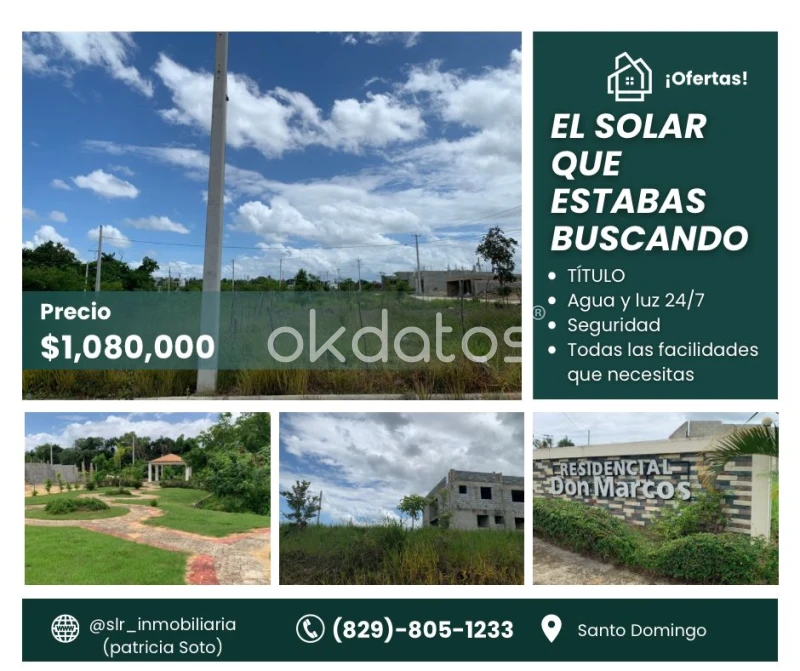 Residencial Don Marcos – Donde tus planes toman forma Ubicado estratégicamente en una zona que está creciendo con fuerza. A tan solo 8 minutos de la parada del metro mama tingo, en la carretera la victoria. Solar urbanizado de 157.51 metros cuadrados, listo para tu proyecto. El precio por metro esta a 8,000. Incluye todo lo que necesitas: -Seguridad privada las 24 horas -Agua potable -Energía eléctrica -Títulos al día y financiamiento disponible Separa con RD$30,000 Tienes 6 meses para completar el inicial en cuotas suaves Lugar perfecto para construir, vivir o multiplicar tu inversión. Contáctanos hoy al 829-805-1233 y hazlo real.