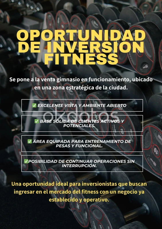 Se vende gimnasio funcionando, en zona estratégica de la ciudad de Cuenca. Excelente vista y ambiente abierto Base sólida para clientes y activos potenciales Área equipada para entrenamiento de pesas y funcional Posibilidad de continuar operaciones sin interrupción Oportunidad ideal para invertir en el mercado fitness con un negocio ya establecido y operativo