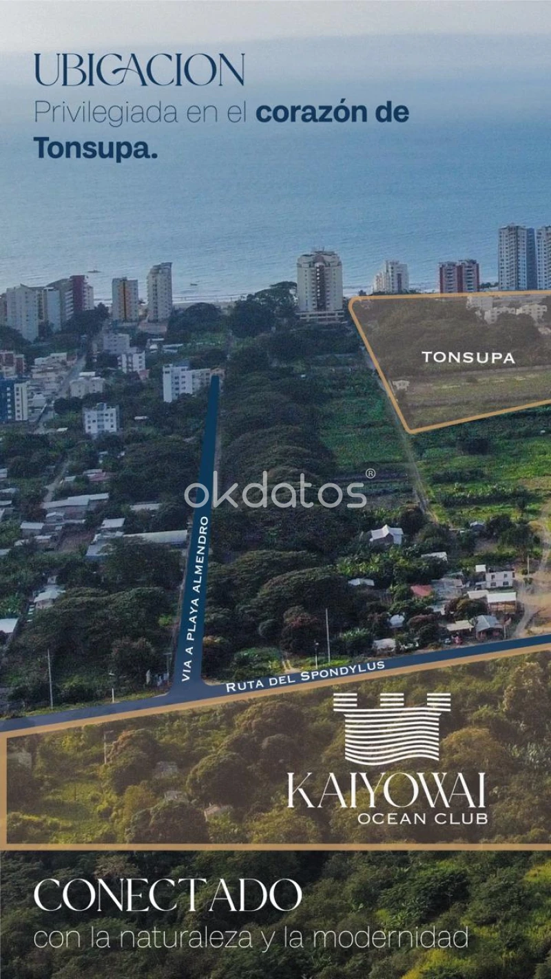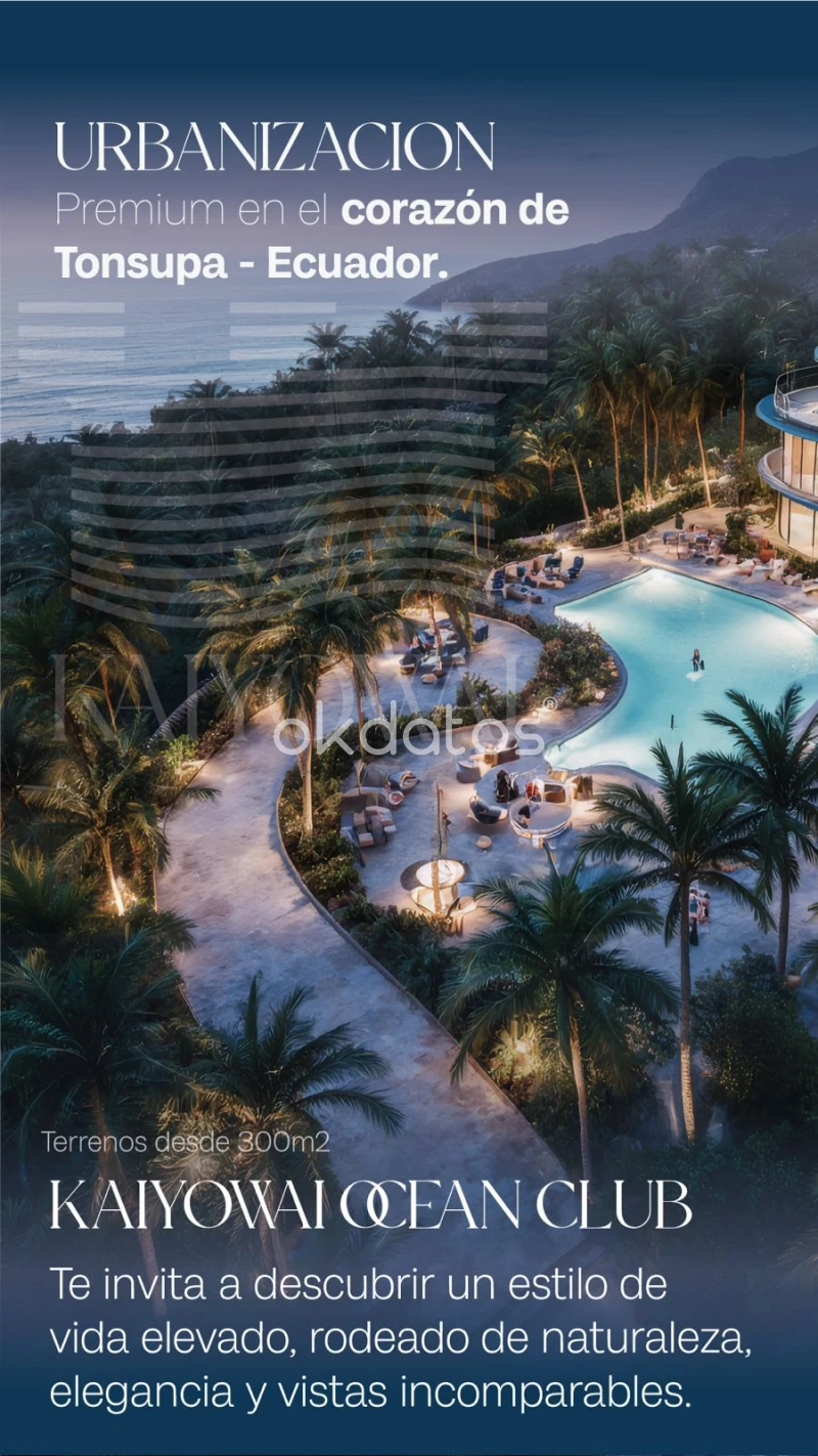 🏡 CONSTRUYE TU LEGADO FRENTE AL MAR 🌊 Adquiere tu terreno desde 300 m² en la prestigiosa Urbanización Kaiyowai Ocean Club en Tonsupa, Esmeraldas. Un proyecto vanguardista sobre 57 hectáreas, diseñado para reconectarte con la naturaleza y elevar tu estilo de vida. 💎 Financiamiento directo hasta 72 meses ¡sin intereses! ✨ Tu casa, tu estilo, tu oasis. Imagina despertar en el lugar donde bienestar, confort y sostenibilidad conviven. Kaiyowai te ofrece: - 🧘♂️ Parque de los Sentidos: zona zen, huerto comunitario, coworking al aire libre - 🎭 Bosque de los Colores: arte urbano, cine bajo las estrellas, muro de escalada - 🧒 Coco’s Park: casa del árbol, golfito temático, bicicross infantil - 🔐 Seguridad 24/7, pet park, consultorio médico - 🏊 Piscinas, canchas deportivas, lounge con fogata, restaurante - 🏡 Country Club exclusivo con coffee shop, vestidores y duchas - 🚧 Infraestructura de calidad: luz soterrada, agua potable, vías adoquinadas 📍 A solo pasos de Playa Almendro y la Ruta del Spondylus. Construye la casa de tus sueños en un entorno donde cada rincón inspira vida. 📲 0994175838 Contáctanos ahora y comienza a vivir el legado Kaiyowai.