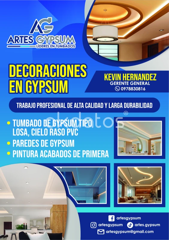 En Artes Gypsum somos líderes en decoraciones en gypsum con acabados modernos, elegantes y de alta calidad. Transformamos tus espacios con diseños innovadores y materiales duraderos. Ofrecemos: Cielo raso en gypsum y PVC Tumbados tipo losa Paredes en gypsum Pintura y acabados de primera Garantizamos un trabajo profesional, limpio y con excelente terminación. Contáctanos y cotiza tu proyecto sin compromiso.