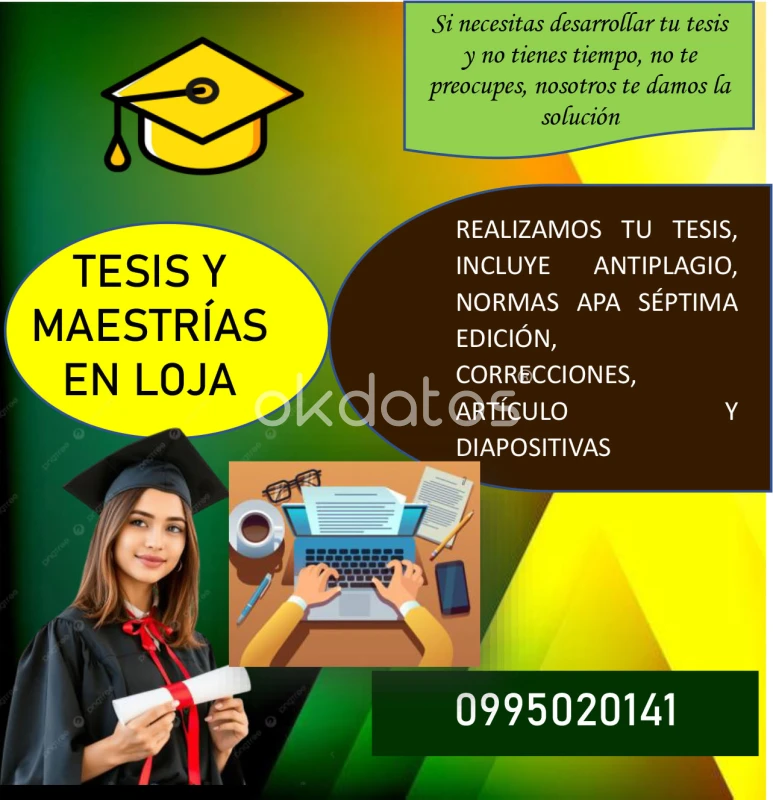 SE DESARROLLA, PROYECTOS INVESTIGACIÓN Y ACADÉMICOS. TESIS DE PREGRADO PARA CUALQUIER CARRERA U UNIVERSIDAD DEL ECUADOR, TESIS DE MAESTRÍA PARA CUALQUIER ESPECIALIDAD Y UNIVERSIDAD DENTRO Y FUERA DEL PAÍS, TESIS DOCTORAL O DOCTORADO PARA CUALQUIER ESPECIALIDAD Y UNIVERSIDAD DENTRO Y FUERA DEL PAÍS, TESIS DE MAESTRÍA CON MÁS DE 12 AÑOS DE EXPERIENCIA, CON PRECIOS ASEQUIBLES, APLICAMOS NORMAS APA SÉPTIMA EDICIÓN, EL TRABAJO INCLUYE DESARROLLO, CORRECCIONES DESDE EL INICIO HASTA LA APROBACIÓN FINAL, SE ENTREGA ARTÍCULO Y DIAPOSITIVAS EN CASO DE REQUERIRSE, SE REALIZA CONTRATO PARA GARANTÍA DE NUESTROS CLIENTES, INFORMES: 0995020141